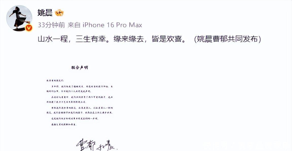 真是让人大跌眼镜,2026 年这才刚过没多久,娱乐圈居然扔出了个重磅炸弹,主角竟是平日里低调得让人快忘了她已婚身份的姚晨。3 月 16 日,她和曹郁突然联手发了声明,坦白两人其实早在多年前就分开了。这事儿最让人摸不着头脑的,恰恰是那份“迟来的官宣”。要知道,就在三个月前的金鸡奖现场,还有人拍到他俩有说有笑,那状态松弛得压根不像闹过别扭的夫妻,谁能想到那竟是“同事加家人”般的默契?